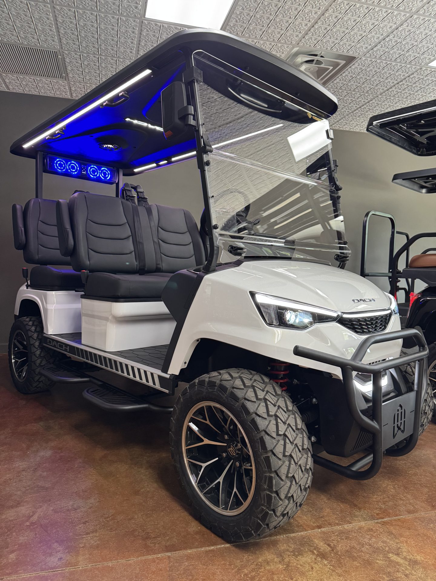 4 Passengers All Seats Facing Forward 73.6V 105AH LiFePO4 Battery and Charger Cruise Control & Intelligent Steering Wheel Automotive Level Monocoque Frame Entertaining Rooftop Tilt steering wheel Self Canceling turning signal Wireless Charging Acrylic Fold-Down Windshield Safety Belts Side Mirrors with Turn Signals Independent Double-Arm Suspension Rear Axle Trailing Arm & High-Strength Spring Shock Absorber One-Piece Double Coating Chassis 12.3-inch TFT LCD Touch Display Reverse Camera LED Front & Rear Light Kit Stereo Surround Sound System Bluetooth System USB & USB-C Connections