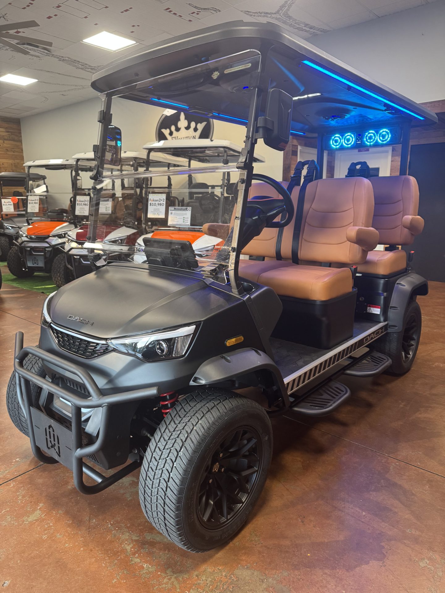 4 Passengers All Seats Facing Forward 73.6V 105AH LiFePO4 Battery and Charger Cruise Control & Intelligent Steering Wheel Automotive Level Monocoque Frame Entertaining Rooftop Tilt steering wheel Self Canceling turning signal Wireless Charging Acrylic Fold-Down Windshield Safety Belts Side Mirrors with Turn Signals Independent Double-Arm Suspension Rear Axle Trailing Arm & High-Strength Spring Shock Absorber One-Piece Double Coating Chassis 12.3-inch TFT LCD Touch Display Reverse Camera LED Front & Rear Light Kit Stereo Surround Sound System Bluetooth System USB & USB-C Connections