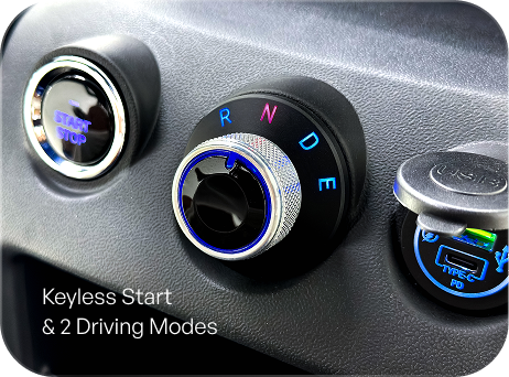 - Curb Weight 1212 lb - Overall Dimensions 114.2 x 54.7 x 80 in - Ground Clearance 5.7 in - Max Speed 25 mph - Travel Distance > 35 mi - Loading Capacity 661 lb - Wheel Base 67 in - Brake System : Front and rear hydraulic disc brakes with Automatic Parking / Emergency brake - Front Suspension: Double A-arm independent suspension + spiral spring + cylindrical hydraulic shock absorber - Rear Suspension Cast aluminum integral rear axle + trailing arm suspension + spring damping, ratio 16:1 - Tire 22/10-14, 225/30R14 - 48V 350A Controller - Battery 48V 105AH LiFePO4 - Motor 5KW Motor - On-board charger 48V 20A - DC Converter 48V/12V-500W